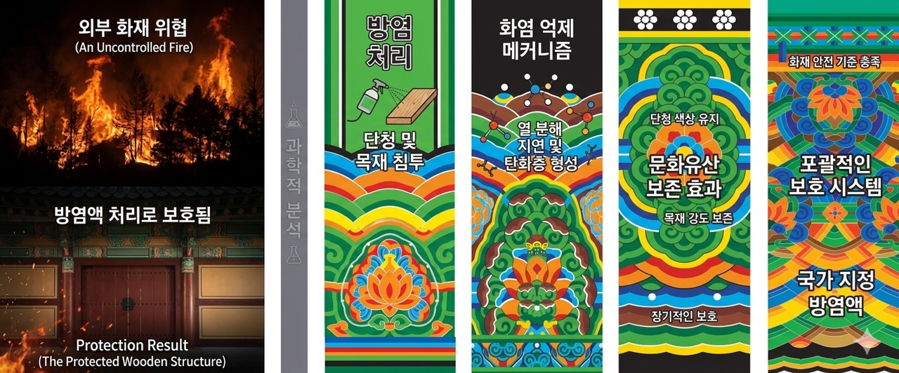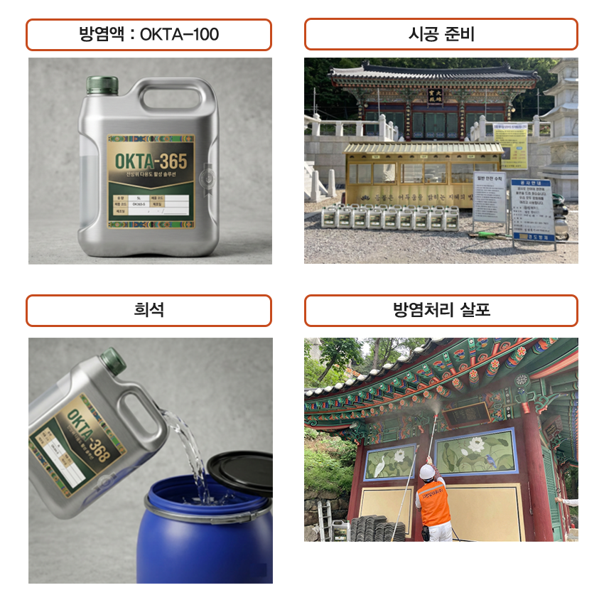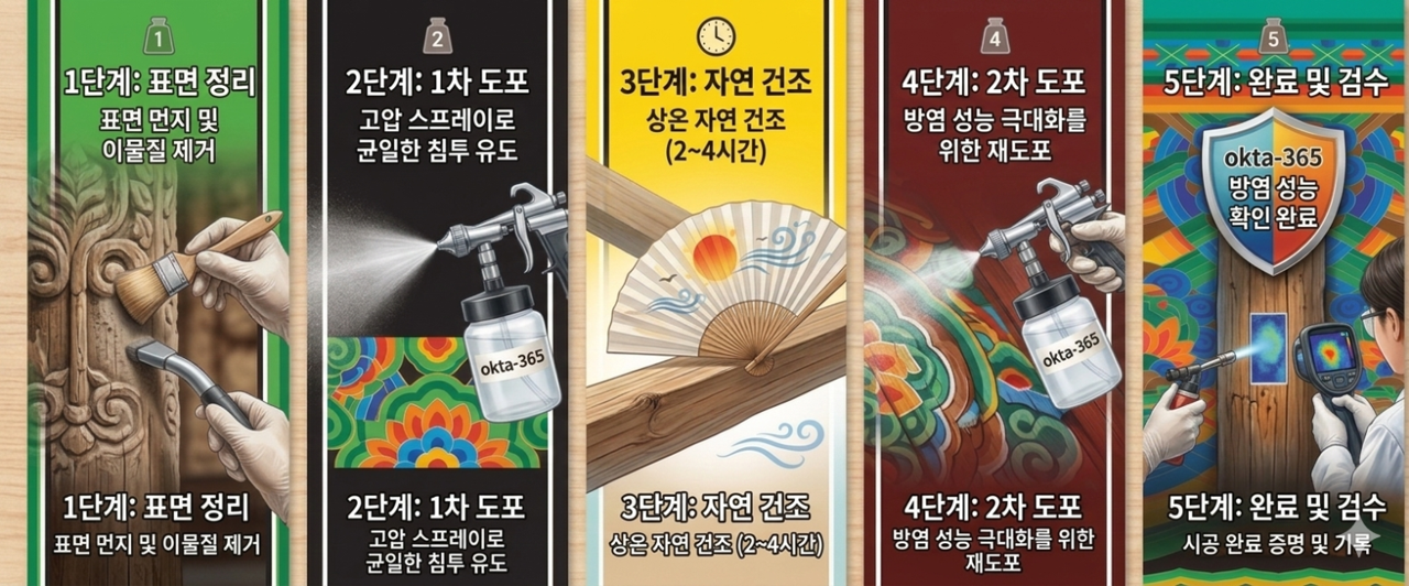 건조 후 백화 현상이 전혀 없어, 국보 및 보물급 문화재의 단청 문양과 색감을 100% 보존합니다. 오히려 시공 후 색감이 더 선명해지는 효과를 제공합니다.